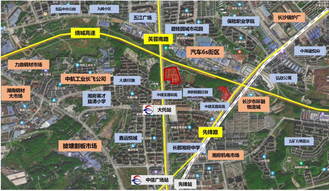 區(qū)位緊鄰長沙繞城高速,為南部片區(qū)起步區(qū):塊位于天心先鋒街道,屬于南部片區(qū)起步區(qū),為長株潭融城樞紐單位,具備區(qū)域整體聯(lián)動(dòng)和資源整合的先天優(yōu)勢。交通便捷,芙蓉路地塊緊鄰地鐵1號線大托站,先鋒路地塊靠近城鐵先鋒路站:①地鐵站:靠近1號線大托站和1號線環(huán)保大道站;②高鐵站:距離長沙南、湘潭北30分鐘左右車程,距離株洲西站50分鐘左右車程;③城鐵站:先鋒站僅4分鐘即達(dá),附近還有昭山站和九郎山站;④長途汽車站:距離長沙汽車南站約12分鐘車程;⑤飛機(jī)場:離長沙黃花機(jī)場約35分鐘車程。處于長株潭商圈,商業(yè)氛圍濃厚:周邊分布有友阿奧特萊斯、中海寰宇城、五江廣場、汽車6s街區(qū)等綜合商業(yè)體。教育資源豐富:地塊緊靠仰天湖中建小學(xué),周邊配套湘府英才益清小學(xué)、長沙市長郡湘府中學(xué)、保險(xiǎn)職業(yè)學(xué)院等學(xué)校,教育資源豐富。